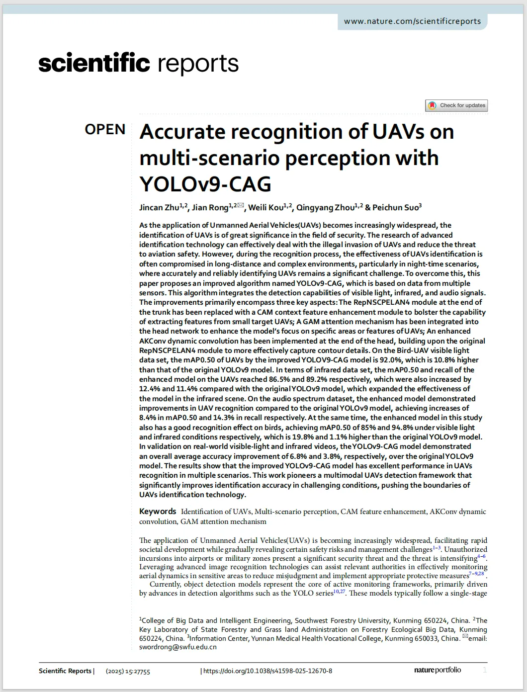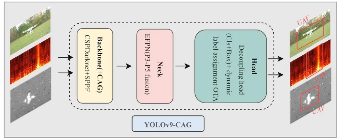 本研究的整体架构如图1所示。框架首先接收多源输入(包括可见光、音频和红外图像),并使用YOLOv9-CAG执行目标检测。该模型具有CAG增强型骨干网络、基于EFPN(融合P3-P5特征)的颈部网络以及通过OTA实现动态标签分配的解耦头部。通过利用多源感知数据,该框架有效提高了复杂环境中小型无人机的检测准确率。