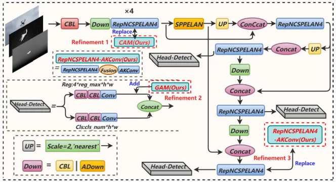 该图展示了三项重要的特征改进:在骨干网络中集成了类激活映射(CAM);在头部网络的中间部分引入了全局注意力机制(GAM);头部网络的最后一层被替换为RepNSCPELAN4-AKConv模块。