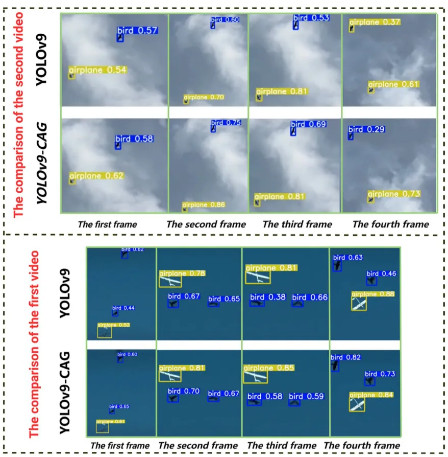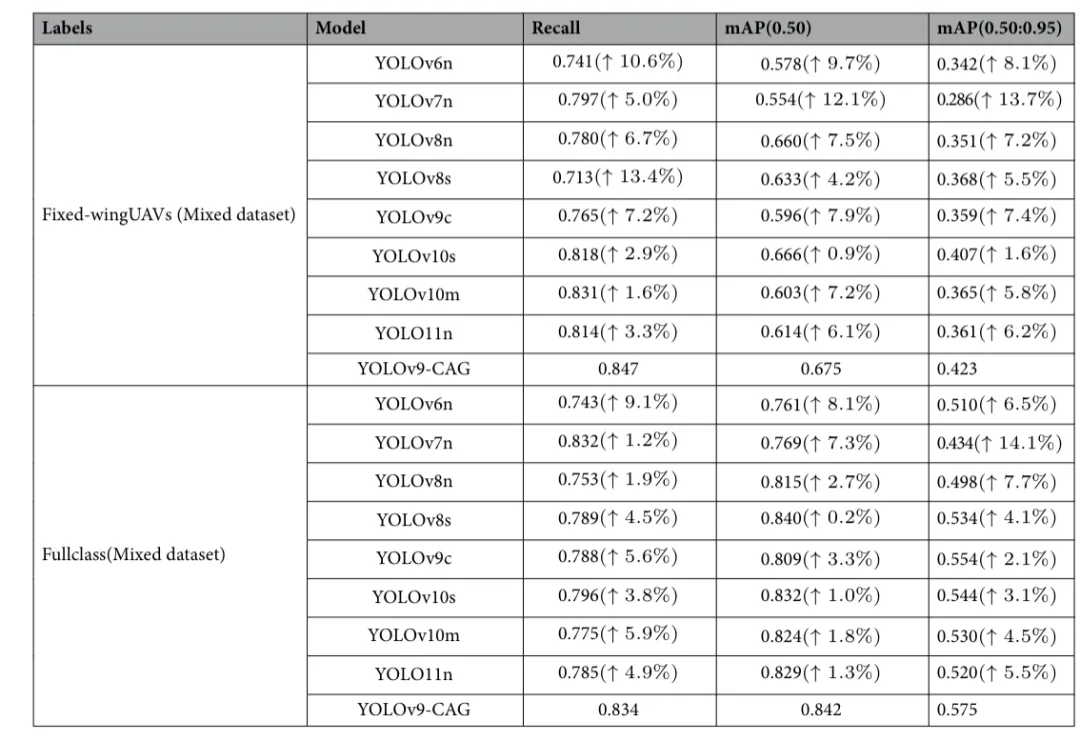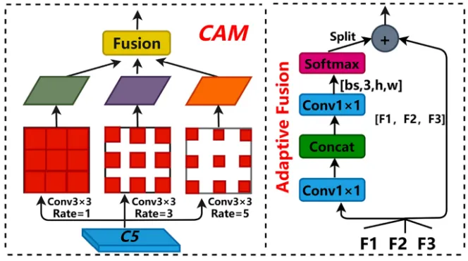 本研究中的CAM主要由两个组件构成。上下文感知模块,用于增强CAM并细化特征网络。如图3所示,CAM以不同速率捕获同一感受野的上下文信息,这对C5模块的集成至关重要。该方法有助于识别图像中的关键特征区域。采用的卷积核大小为3×3,卷积速率设为1、3和5。CAM采用三种特征融合技术:Weight(加权)、Adaptive(自适应)和Concat(拼接)。在这些方法中,自适应融合技术在准确率上的提升最为显著。自适应融合结构通过对浅层和深层特征自适应分配权重,有效整合细节信息和语义内容。浅层特征强调细节和空间位置信息,深层特征通过特征卷积、特征融合和Softmax操作封装更丰富的语义内容。这两种特征的加权融合增强了模型的多尺度感知能力,使其在各种场景中能更准确地聚焦目标区域,从而提升分类和检测任务的整体性能。通过大量实验,本研究证明,将CAM的自适应融合方法集成到原始YOLOv9骨干网络的最后一层,可显著增强模型的特征提取能力。这种改进在复杂环境中对无人机和小型鸟类目标关键特征的提取上尤为突出。