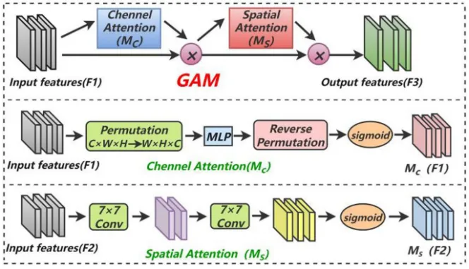 图4展示了GAM注意力机制,它同时集成了通道注意力和空间注意力。首先,通道注意力机制采用全局平均池化和最大池化来分析输入特征图的每个通道,有效聚合与每个通道相关的全局信息。随后,池化结果通过一个两层全连接网络传递,其中利用激活函数(如sigmoid)为每个通道生成权重。这些权重反映了每个通道相对于当前任务的重要性差异。最后,这些权重被依次与原始特征图的通道相乘,以调节每个通道的响应强度。这一过程有助于增强重要的通道特征,同时抑制不太重要的特征。空间注意力的过程始于沿通道维度对输入特征图进行聚合,通常采用平均池化和最大池化技术生成两个二维特征图。然后将这两个特征图结合,形成全面的空间特征表示。随后,利用小卷积核(如7×7)对生成的特征图进行卷积,得到空间权重图。该权重图指示了各个空间位置的显著性,并与经过通道注意力处理的特征图逐元素相乘。这一操作使模型能更专注于图像中重要的空间区域。在两种注意力机制分别完成各自任务后,GAM模块的输出特征图在通道和空间维度上均得到优化,从而在分类、检测等任务中提升模型性能,同时确保较高的计算效率和良好的可解释性。
