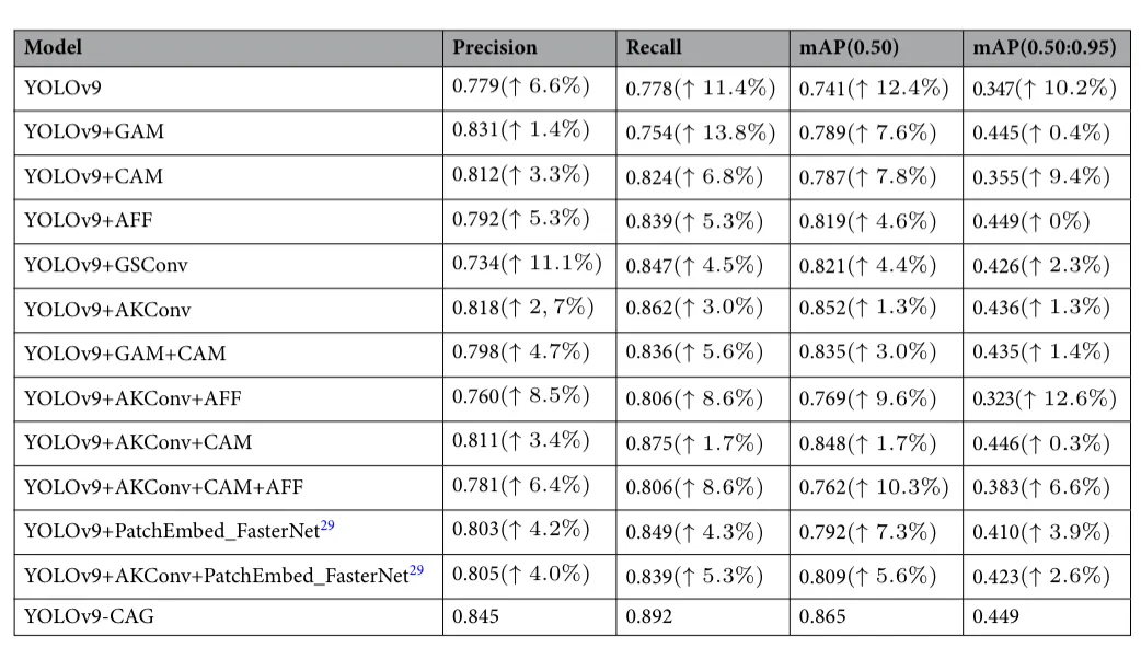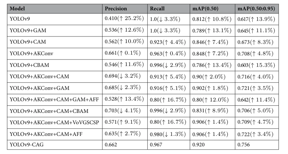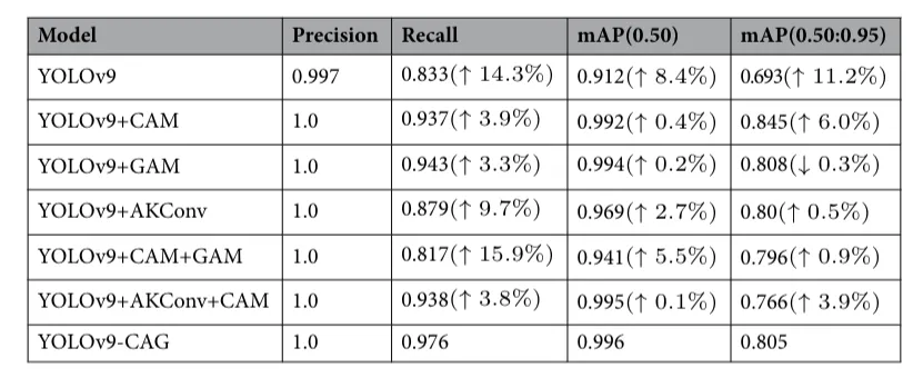 YOLOv9的创新架构使其在高精度识别任务中极具效能。其主要组件包括骨干网络RepNSCPELAN4和解耦头部结构。在此基础上,本研究提出的增强型YOLOv9-CAG模型如图2所示。