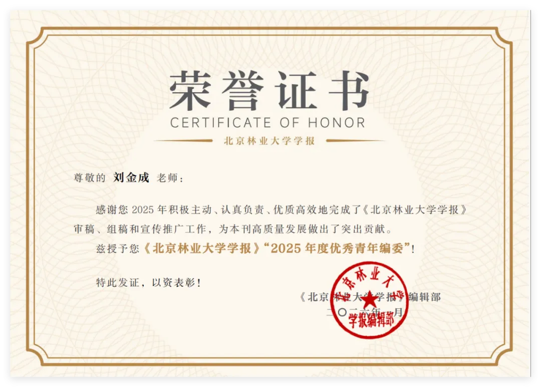 近日,《北京林业大学学报》编辑部公布了评选结果,作为学报第一届青年编委会成员,西北农林科技大学Forestry AI Lab刘金成教授因其在2025年度担任该刊青年编委期间的突出贡献,荣获“2025年度优秀青年编委”称号。这一荣誉既是对个人学术服务精神的充分肯定,也反映了我们课题组在支撑高质量学术平台建设中的积极参与。