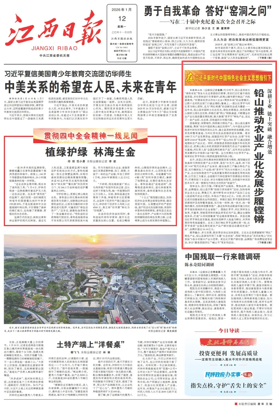 本报铅山讯 (全媒体记者余燕)冬日时节,铅山县英将乡“绿和有机”等各大生态茶园依旧青翠,茶农们正忙着升级改造茶园,并对茶树进行冬季管护;武夷山镇岑源竹制品厂内机器轰鸣,“村集体经济合作社+企业+帮扶车间”的运营模式,让数十名村民在家门口就业增收;餐桌上,一款以红芽芋与河红茶为核心原料、名为“两红相遇”的创新饮品成为爆款……近年来,铅山县牢固树立生态优先、绿色发展理念,依托武夷山国家公园生态优势,积极打通“两山”转换通道,不断健全农业产业化高质量发展机制,做大做强“茶芋竹”特色产业,走出了一条产业旺、生态美、百姓富的乡村振兴路。
