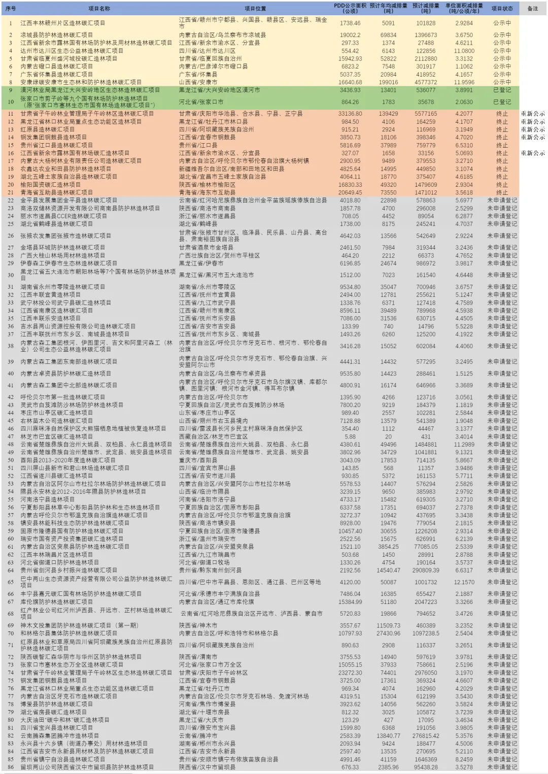 依据“全国温室气体自愿减排注册登记系统及信息平台”(https://ccer.cets.org.cn/) 整理汇总。截止到2026年1月12日,平台已公示了86个造林碳汇项目、5个红树林营造项目。