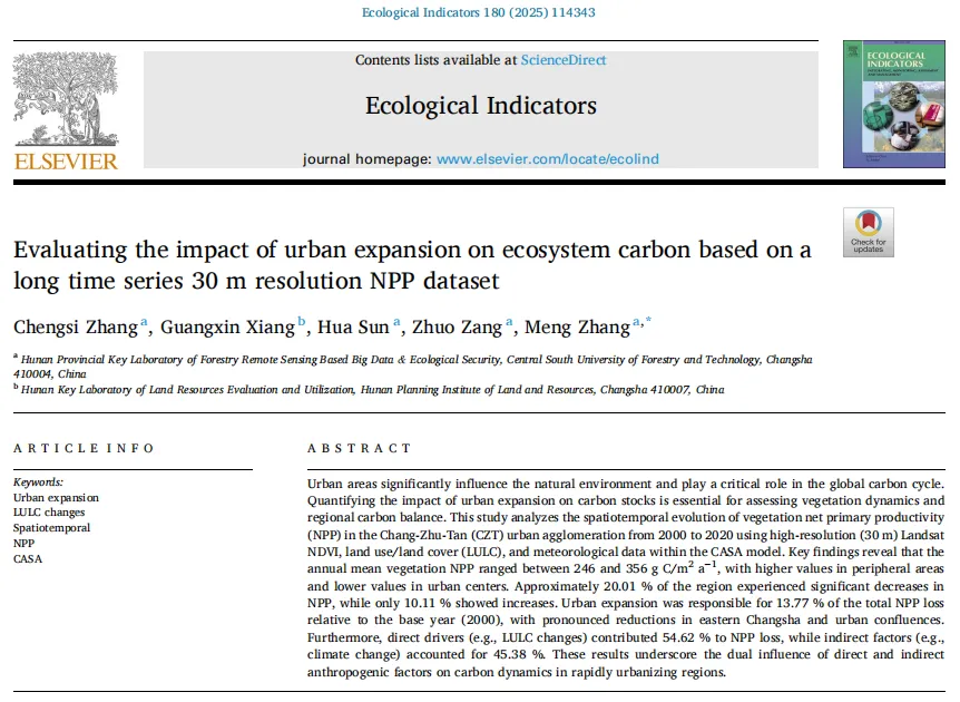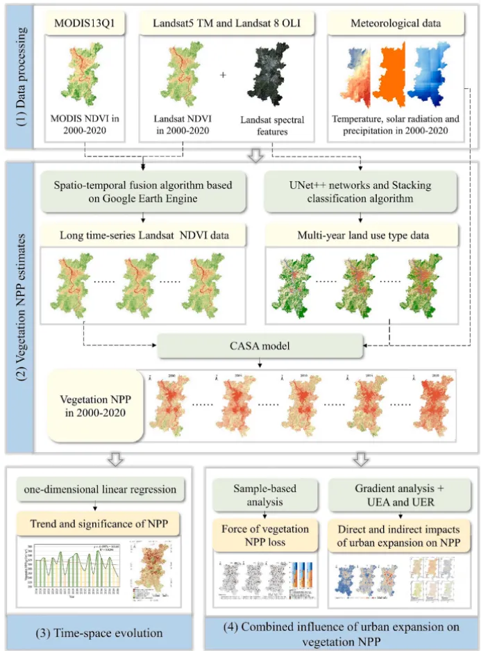植被作为陆地生态系统的关键组成部分,在调节全球碳平衡中扮演着核心角色。植被净初级生产力(NPP)是衡量生态系统碳汇能力的重要指标。随着全球城市化进程加速,城市扩张通过改变土地利用/覆被(LULC)及局地环境,已成为影响区域NPP变化的主要驱动力。然而,以往研究受限于中低分辨率NPP数据,难以捕捉高度异质性的城市景观细节,且大多聚焦于城市扩张的直接影响(即LULC转换),对间接影响(如气候变化、社会经济因素)的系统性量化不足。