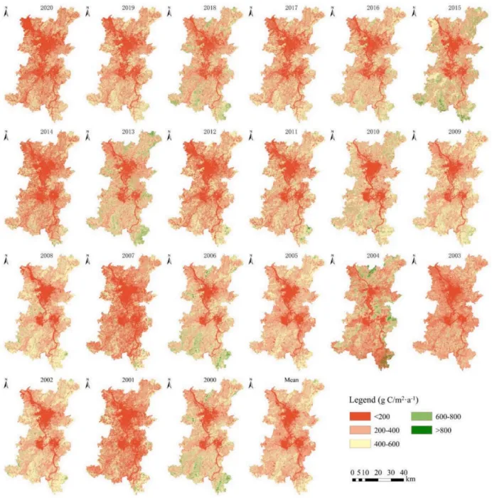 验证表明,估算的30米分辨率NPP与实地调查数据具有良好一致性(R² = 0.7573)。2000-2020年间,CZT地区年均植被NPP为308.42 g C/m²·a,空间上呈现“周边高、中心低”的格局。高值区(>400 g C/m²·a)分布于远离市中心的森林区,低值区(0-200 g C/m²·a)集中于城市核心区及水域。
