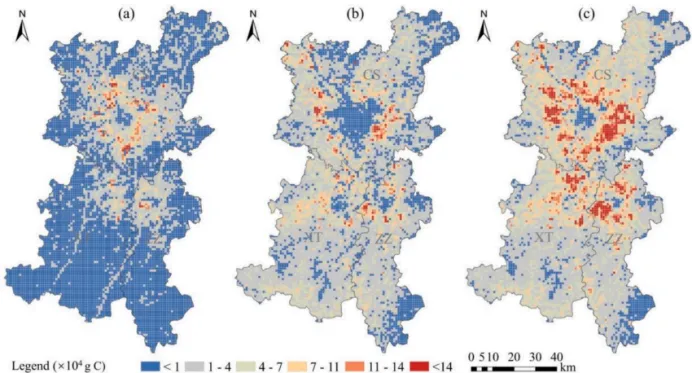 2000-2020年间,CZT城市建设用地面积扩大了约3.64倍。城市扩张导致植被NPP总损失达4.21×10⁸ g C,占2000年区域总NPP的13.77%。长沙市的NPP损失最大(占总量51.57%),其次为湘潭和株洲。2010-2020年间的NPP损失量较2000-2010年增加了约1.23倍,反映出长株潭一体化进程的加速。空间上,NPP高损失区集中在长沙东部、三市交界处。
