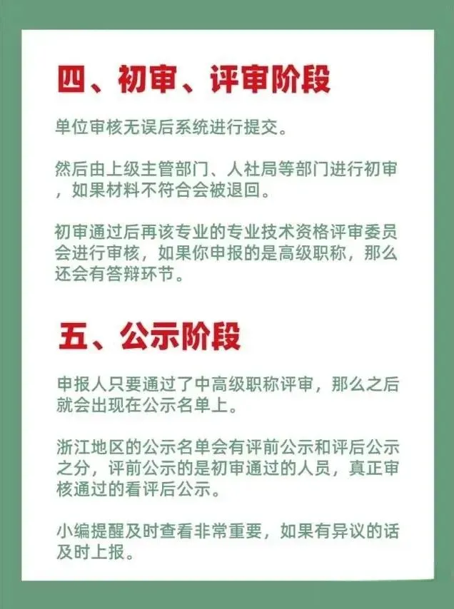 杭州市职称评审的流程一般分为提交材料及申报审核、评前公示、评审、结果公示和评审结果备案、下载证书等几个阶段。