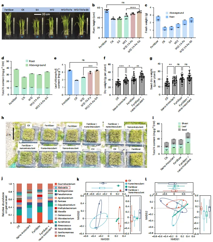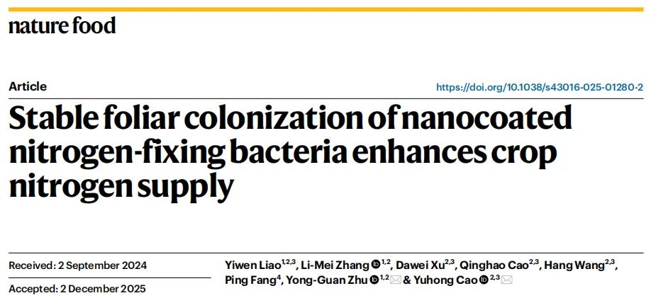 Yiwen Liao, Li-Mei Zhang, Dawei Xu, et al. Stable foliar colonization of nanocoated nitrogen-fixing bacteria enhances crop nitrogen supply, Nature Food,2025.