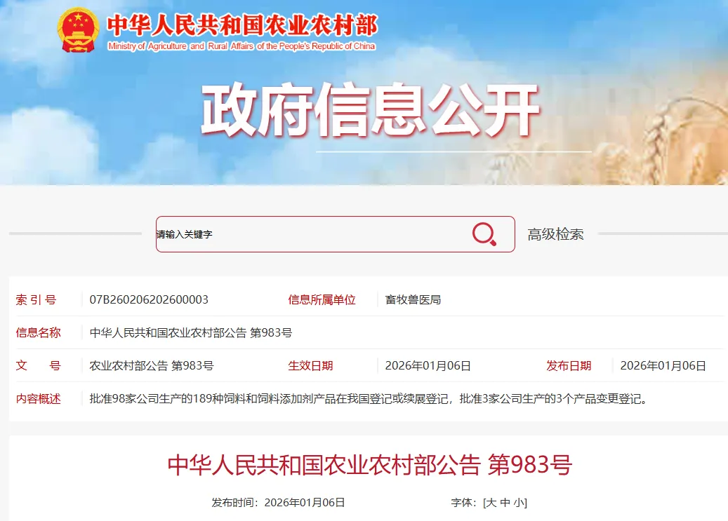 政策‖农业农村部批准98家公司生产的189种饲料和饲料添加剂产品在我国登记或续展登记