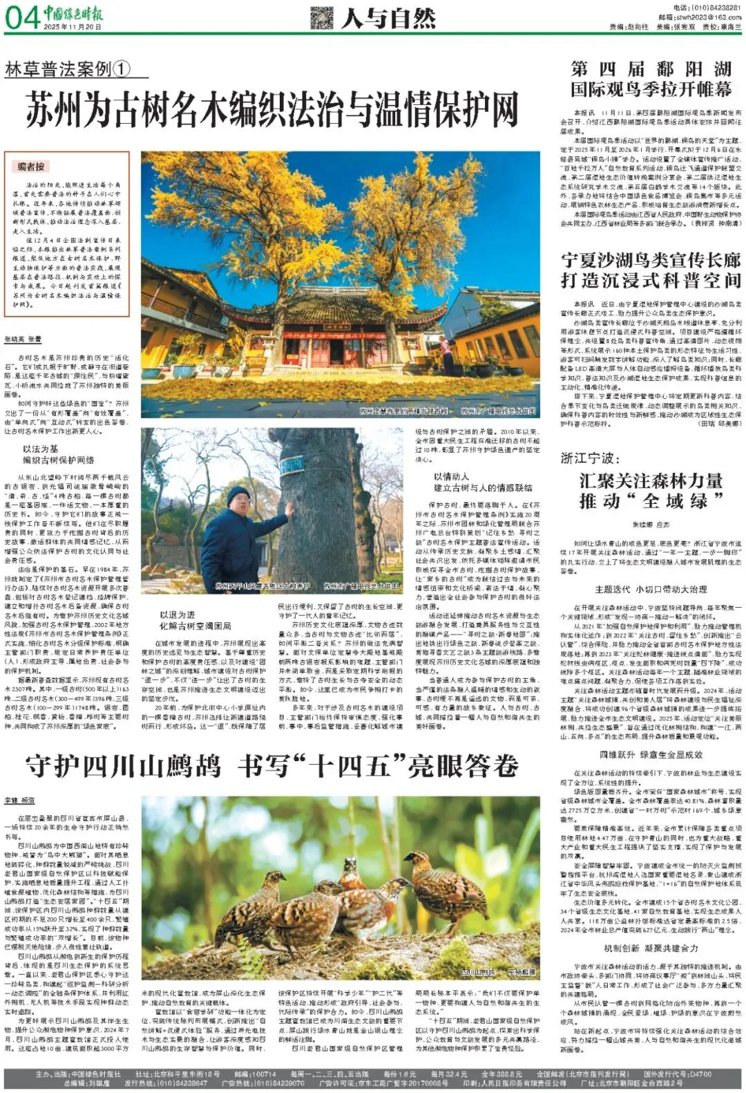 古树名木是苏州珍贵的历史“活化石”。它们或扎根于旷野,或静守在街道巷陌,是这座千年古城的“原住民”,与粉墙黛瓦、小桥流水共同绘就了苏州独特的美丽画卷。