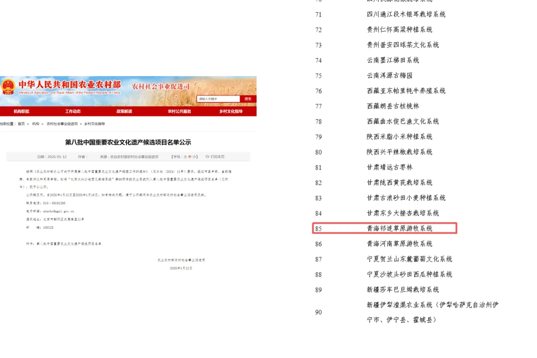 1月12日,农业农村部农村社会事业促进司正式公示第八批中国重要农业文化遗产候选项目名单,其中,海北州“青海祁连草原游牧系统”成功入选,成为全国90项传统农业系统中一份子,这是海北州祁连县在农业文化遗产保护与传承工作中取得的重大突破,标志着祁连县以牦牛、祁连羊养殖为核心的传统游牧文化与生态农业发展模式获得国家层面的高度认可。