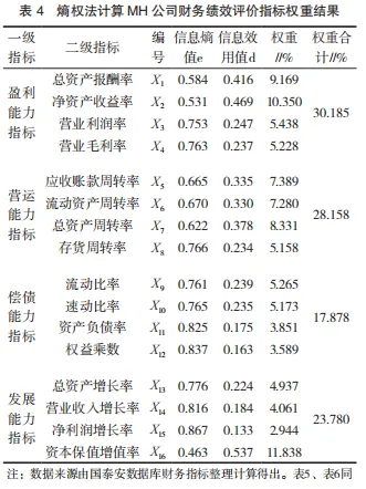 利用熵权法对MH公司2019—2023年的财务绩效指标进行计算分析,得到财务绩效各个维度16个二级指标所占的权重,计算结果如表4所示。