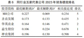 通过上述同样方法,选取MH公司所处畜牧业代表公司2023年4个维度相关16个二级财务指标进行计算分析,并将5家公司2023年财务绩效表现进行优劣排序,结果如表6所示。由表6可以看出,在2023年5家畜牧业公司财务绩效表现中,益生股份相对接近度为0.678,财务绩效表现良好;其次是华英农业以及圣农发展,相对接近度分别为0.471和0.435;其余两家相对接近度得分较低,神农集团为0.398,MH公司得分为0.234,在同行业中排名较为靠后。根据2023年MH公司财务数据可以看出,2023年MH公司实现营业收入20.74亿元,同比增长28.96%,对比MH公司2022年财务数据,虽然营业收入有所增长,但财务绩效表现欠佳,还需提升财务绩效水平及其在同行业竞争中的地位。