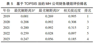 通过TOPSIS法对MH公司2019—2023年的财务绩效进行改进和综合得分指数计算,并进行优劣排序,结果如表5所示。