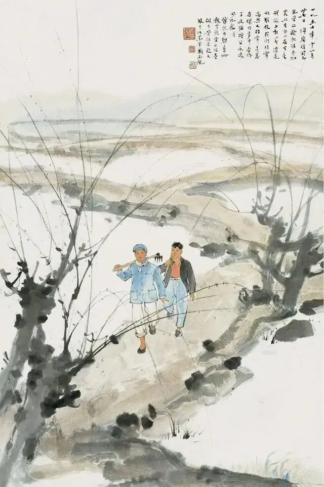 《光荣参加农业生产》是由傅抱石、郑秉珊、魏紫熙、宋文治、李仞千、叶矩吾、包之风七位画家于1957年合作完成的中国书画作品,尺寸为67×44cm。该作品创作于傅抱石担任江苏省中国画院院长期间,为纪念强广治获批参加农业生产活动而作。画面采用平远构图描绘两名农民装扮者扛劳动工具前行的场景,人物面容喜悦,呈现20世纪50年代的朴实风格。题跋以直白口语表达欢快情绪,树木、水渚及题跋笔法推测出自傅抱石,人物形象则带有魏紫熙的绘画特征。傅抱石的笔墨线条如“长枪大戟”挥洒于尺素间,作品通过知识分子支援农业建设的主题,折射出特定历史时期的时代印记