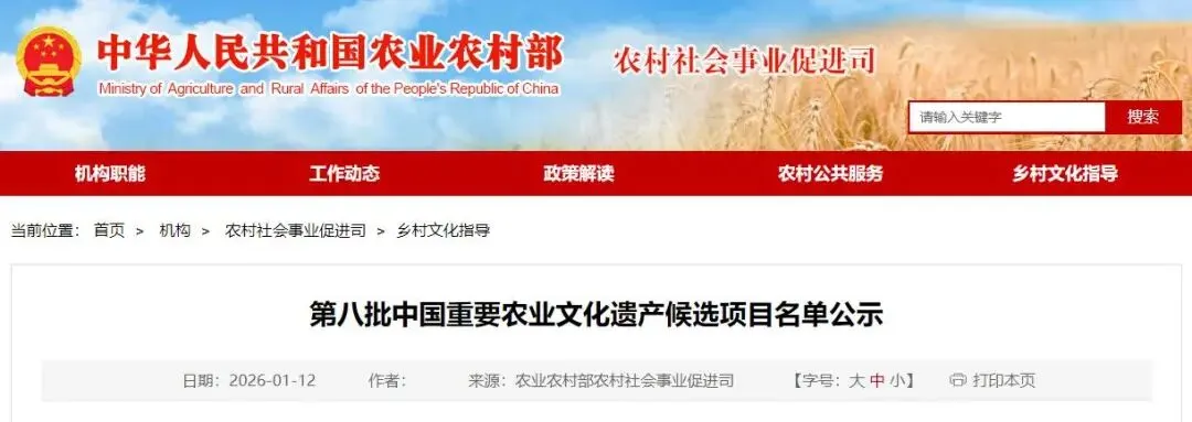 按照《农业农村部办公厅关于开展第八批中国重要农业文化遗产挖掘工作的通知》(农办社〔2024〕11号)要求,经过市县申报、省级推荐、专家评议和司局审核,拟将“北京大兴沙地西瓜栽培系统”等90项传统农业系统列入第八批中国重要农业文化遗产候选项目名单(见附件),现予以公示。