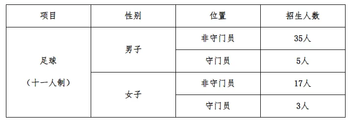 招生计划拟定为60人,其中足球(男子)40人;足球(女子)20人。如有变化以上级相关文件规定为准,各项目计划招收人数拟定如下: