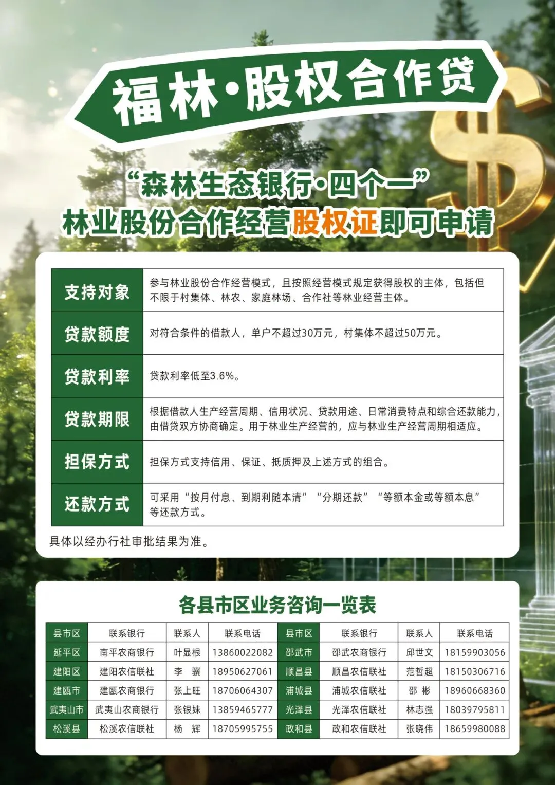 “福林·股权合作贷”是南平市林业局联合中国人民银行南平市分行、福建省农村信用社联合社南平办事处共同推出的林业金融创新产品,旨在进一步深化推广“森林生态银行·四个一”林业股份合作经营模式,通过金融赋能实现扩面增量和提质增效。