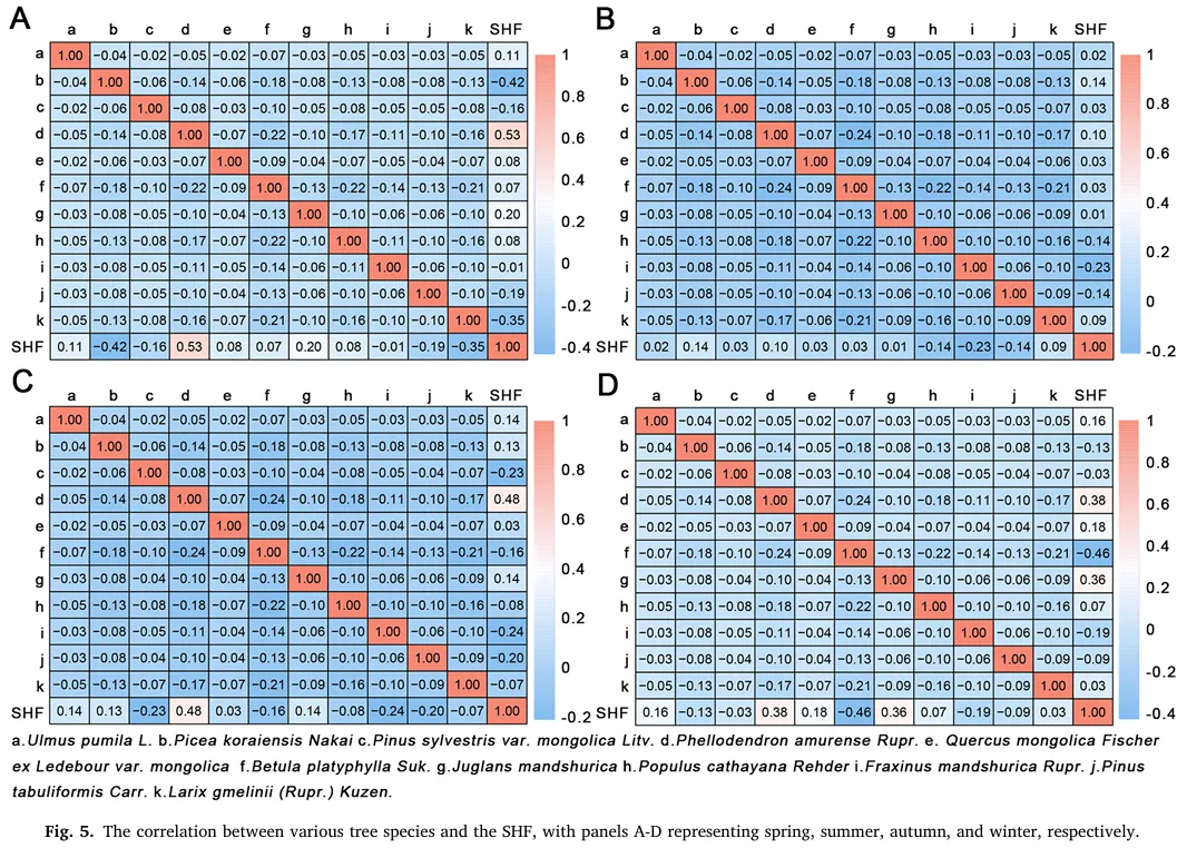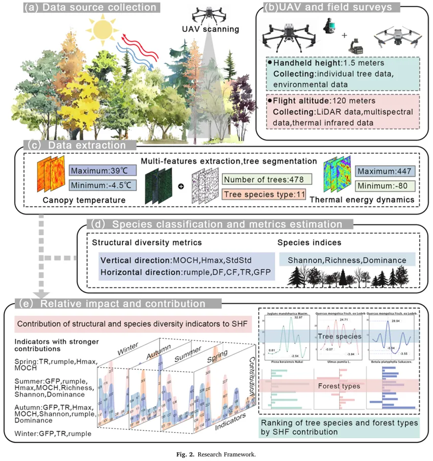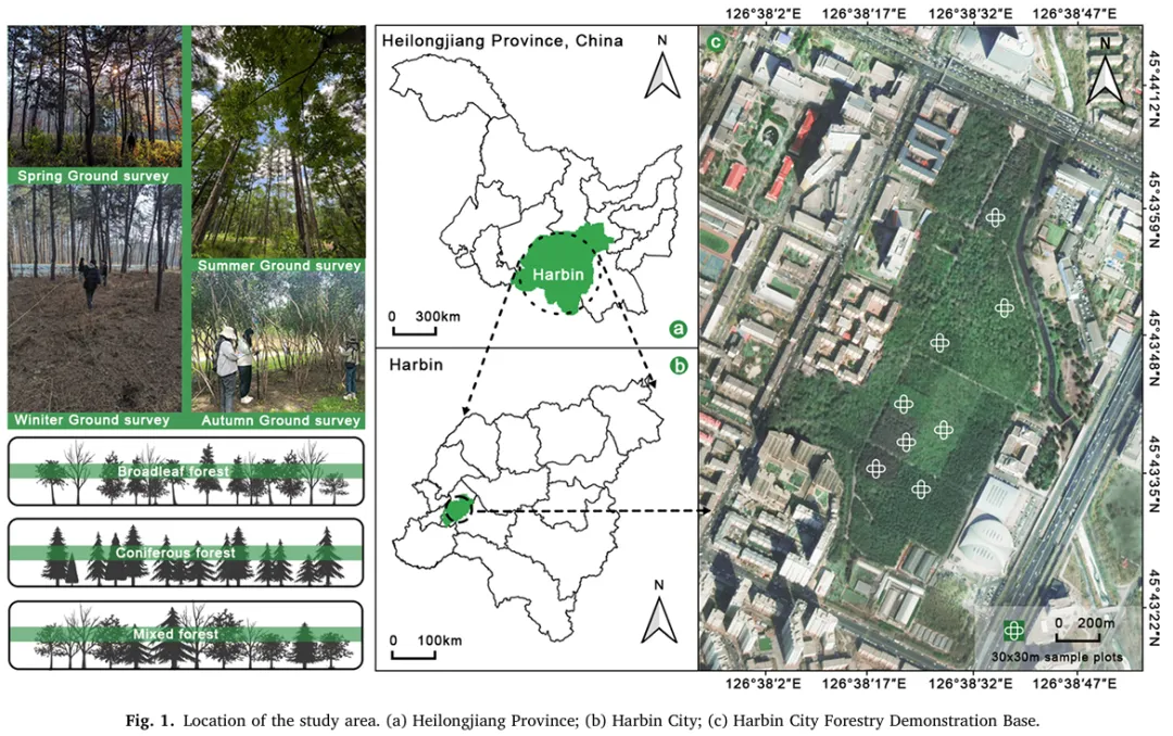 DOI:https://doi.org/10.1016/j.ufug.2025.129215城市森林树种和三维结构直接影响了城市森林感热通量(Sensible Heat Flux,SHF)的动态变化,间接调控了城市森林空间热能的分配。然而,城市森林树种、三维结构对SHF的多季相动态影响仍未明确,这阻碍了我们从不同尺度出发通过改变树种、三维结构调控城市森林能量流动。为了应对这些挑战,我们筛选了72个城市典型森林群落,协同无人机搭载热红外、激光雷达、多光谱及便携式气象设备,创建了森林树种、三维结构和气象数据与SHF的综合分析框架,探究了中小尺度城市森林感热通量的季节性分布情况,且在单木和集群尺度上明确了城市森林树种、三维结构对SHF季节动态的影响潜力。结果表明:(1)高分辨率无人机技术融合野外实地测量实现了中小尺度城市森林感热通量的量化,城市森林感热通量分布具有显著的季节性特征;(2)在单木尺度上,我们发现夏季针叶树樟子松(Pinus sylvestris var. mongolica Litv.)、黑皮油松(Pinus tabuliformis Carr.)、兴安落叶松(Larix gmelinii (Rupr.) Kuzen.)对SHF的影响能力最强,相反在其他季节,阔叶树胡桃楸(Juglans mandshurica)、蒙古栎(Quercus mongolica Fischer ex Ledebour var. mongolica)对SHF的调控能力最强;各单木指标与SHF相关性在春秋季表现为P-E>H>DBH、CBH>P-N,夏冬季表现为P-N>DBH>H、P-E>CBH,季节性差异显著;(3)集群尺度上,相较针叶林,阔叶林和混交林在调节SHF方面发挥着更为重要的作用,此外,空隙分布比例(GFP)和最大冠层高度(Hmax)是影响SHF的最关键三维结构因子。本研究为深入探讨单木与集群视角下城市森林与感热通量的动态关系提供了重要参考,并为调控城市森林季节性热能流动提供了针对性规划依据,有助于未来城市森林管理建设与优化。