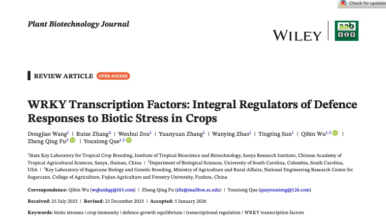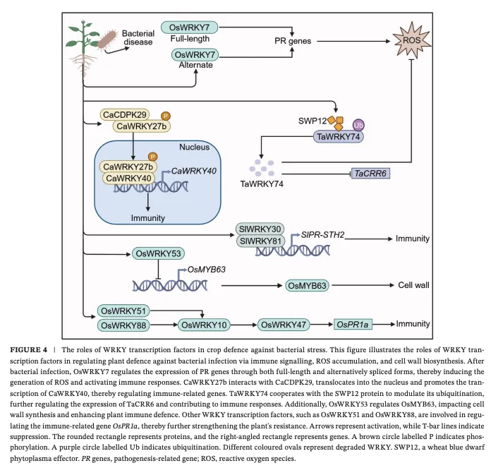 图4: WRKY转录因子在作物防御细菌胁迫中的作用。该图展示了WRKY转录因子通过免疫信号、ROS积累和细胞壁生物合成调控植物防御细菌侵染的作用。