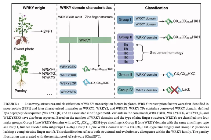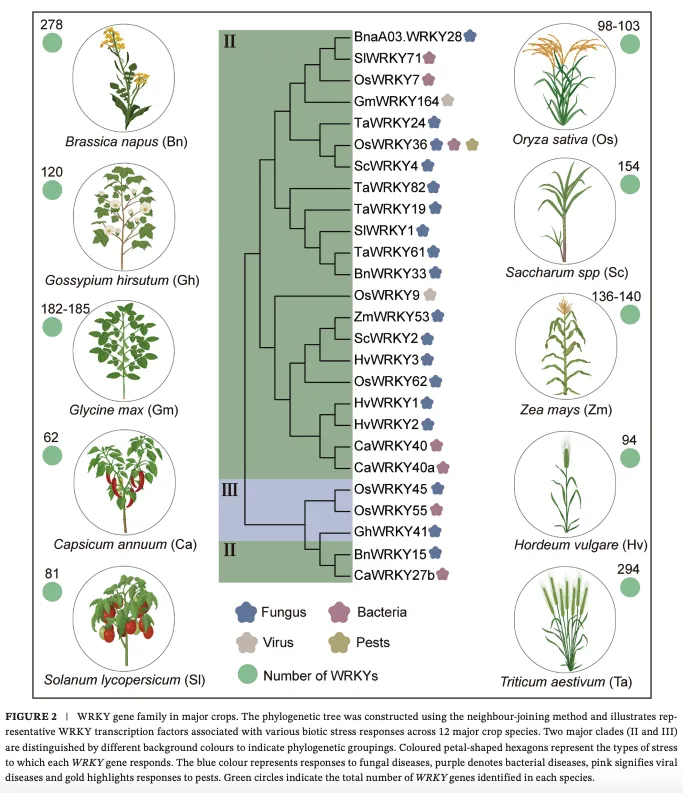 作物持续面临生物胁迫,包括真菌、细菌和病毒性病原体以及害虫,导致全球范围内严重的产量和质量损失。WRKY转录因子构成一个植物特异性且功能多样的家族,是免疫调节的核心。基因组资源和多组学方法的最新进展加速了对作物中WRKYs的鉴定和功能表征。本文综述了WRKY基因的结构特征、分类及其在作物物种中的全基因组分布,并综合了介导对主要类别生物胁迫抗性的以WRKY为中心的调控模块。在抗真菌防御中,WRKYs增强模式触发和效应子触发的免疫,调节蛋白质稳定性并重编程次级代谢。在抗细菌免疫中,它们将细菌感知与细胞壁重塑、激素和氧化还原信号联系起来。WRKYs还激活病程相关蛋白基因表达、细胞壁加固、RNA干扰和程序性细胞死亡以对抗卵菌、病毒性病原体和害虫。总体而言,WRKYs作为依赖情境的转录枢纽发挥作用。它们整合免疫信号与激素串扰,重塑防御基因网络,并调整次级代谢,从而塑造生物胁迫下的抗性结果。本文考察了WRKY介导的防御与生长权衡,并探讨了利用以WRKY为中心的网络进行育种和工程化,以获得广谱、持久的病害和害虫抗性的机会。文章还强调了将多组学与精准基因组编辑、合成生物学、基因驱动技术和人工智能相结合如何能够确立WRKYs作为提高作物韧性和性能的核心分子靶标。图1: 植物中WRKY转录因子的发现、结构与分类。WRKY转录因子首次在甘薯中发现,随后在欧芹中鉴定为WRKY1、WRKY2和WRKY3。WRKY TFs包含一个保守的WRKY结构域,其定义为一个七肽序列和一个相关的锌指基序。基序核心的变体亦有报道。基于WRKY结构域的数量和锌指结构的类型,WRKYs分为四个主要组别。该分类反映了WRKY家族内的结构和进化差异。图2: 主要作物中的WRKY基因家族。系统发育树采用邻接法构建,展示了12种主要作物中与各类生物胁迫反应相关的代表性WRKY转录因子。两个主要分支通过不同背景颜色区分。彩色花瓣状六边形代表每个WRKY基因响应的胁迫类型。圆圈表示各物种已鉴定的WRKY基因总数。