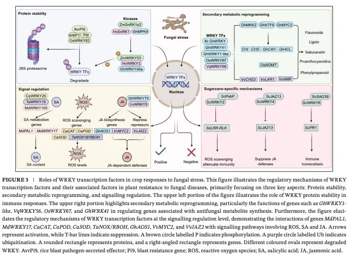 图3: WRKY转录因子在作物响应真菌胁迫中的作用。该图展示了WRKY转录因子及其相关因子在植物抗真菌病害中的调控机制,主要关注蛋白质稳定性、次级代谢重编程和信号调节三个关键方面。