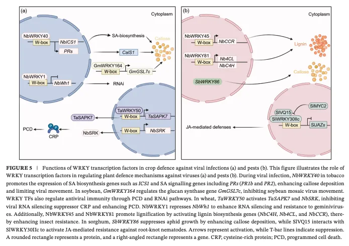 图5: WRKY转录因子在作物防御病毒侵染和害虫胁迫中的作用。该图展示了WRKY转录因子在调控植物防御病毒和害虫机制中的作用。