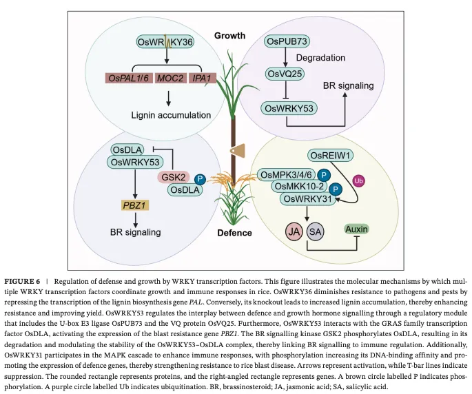 图6: WRKY转录因子对防御与生长的调控。该图展示了多个WRKY转录因子在水稻中协调生长和免疫反应的分子机制。
