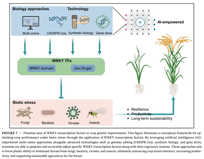 图7: WRKY转录因子在作物遗传改良中的潜在应用。该图展示了通过应用WRKY转录因子优化作物在生物胁迫下性能的概念框架。