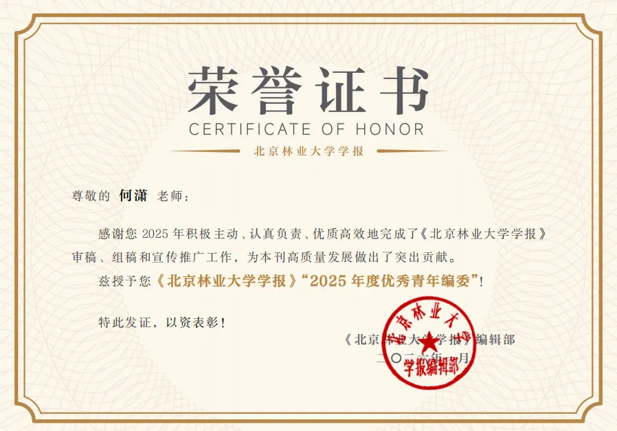 近日,《北京林业大学学报》编辑部基于工作量综合评估,授予我所何潇副研究员《北京林业大学学报》“2025年度优秀青年编委”荣誉。