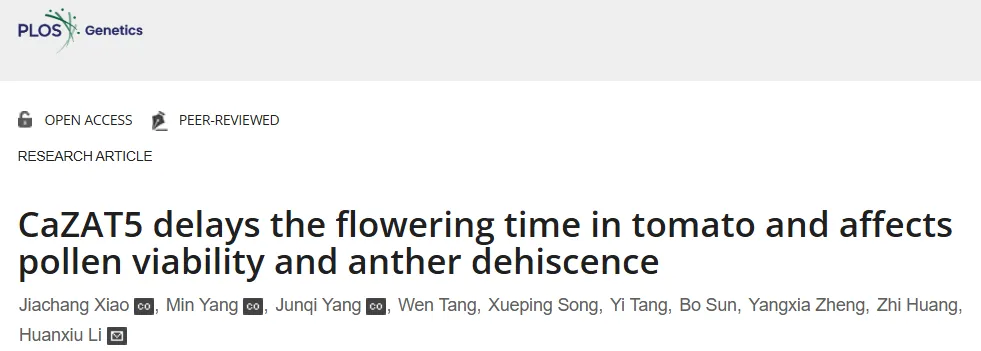 近日,四川农业大学园艺学院李焕秀教授蔬菜种质资源创新与新品种选育团队在N1级自然指数期刊《PLOS Genetics》上发表了题为“CaZAT5 delays the flowering time in tomato and affects pollen viability and anther dehiscence”(辣椒CaZAT5转录因子延迟番茄开花时间、影响花粉活力与花药开裂)的研究论文。该研究加深了辣椒CaZAT5在调控开花时间和雄性育性方面潜力的理解。