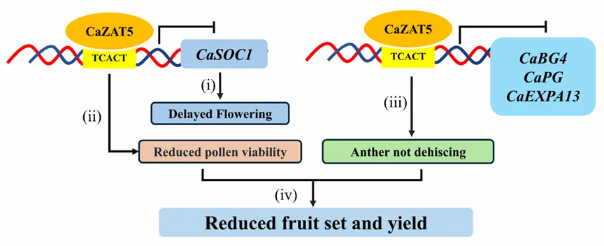 功能性雄性不育是一种特殊的雄性不育类型,指植物虽能产生花粉,但由于花药开裂缺陷致使花粉粒释放失败而导致不育。此类雄性不育在农业生产中无需选育保持系,可以极大地降低了杂交种子生产的复杂性和成本。为探究辣椒花药开裂的分子基础,该研究聚焦于辣椒中C2H2型转录因子CaZAT5展开研究,将CaZAT5过表达在模式植物番茄中发现CaZAT5通过抑制开花整合基因CaSOC1的表达来延迟开花,参与调控开花时间与雄性育性;更为重要的是,过表达CaZAT5在番茄中引发了两类显著表型,一是花粉活力下降;二是花药不能正常开裂。进一步结合DAP-seq、Y1H、Dual-LUC和EMSA等试验,发现CaZAT5通过抑制细胞壁降解相关基因的表达,从而影响花药开裂过程。