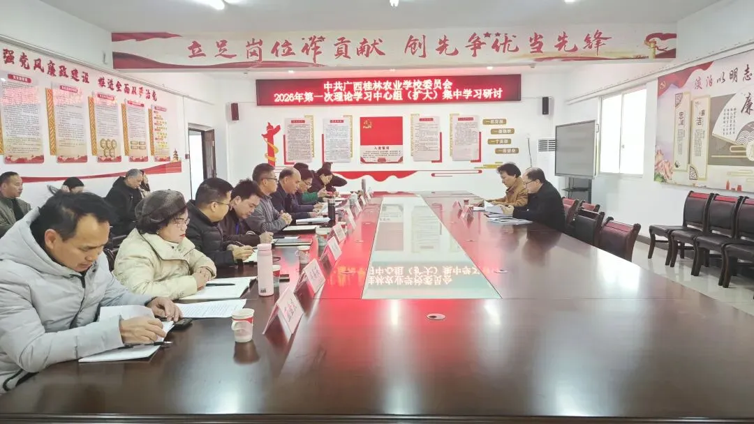 为深入学习宣传贯彻党的二十届四中全会精神,切实把全校党员干部的思想统一到党的二十届四中全会精神上来,广西桂林农业学校党委理论学习中心组近期在图书综合楼三楼党员活动室室召开党委理论学习中心组2026年第一次专题学习研讨会暨学习贯彻党的二十届四中全会精神专题研讨会。桂林市委教育工委委员,市教育局党组成员、副局长陈念进同志,市教育局职成科科长关志强同志到会指导。学校领导班子全体成员、全体中层干部、各党支部书记参加学习。会议由学校党总支书记、校长班祥东主持。