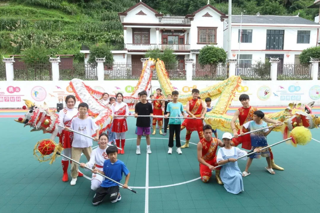 “好厉害!这‘龙’也太酷了吧!我能摸摸吗?”雪峰山中“巨龙”起舞,笑声回响。薪火相传服务团依托学校体育、舞蹈表演专业优势,开展传统文化传承教育,细致指导坪溪村小朋友们挥舞彩带龙上下翻腾、蜿蜒起舞,在游、穿、腾、跃、翻、滚的舞龙教学中体验、探索、发现民族传统体育文化的魅力。
