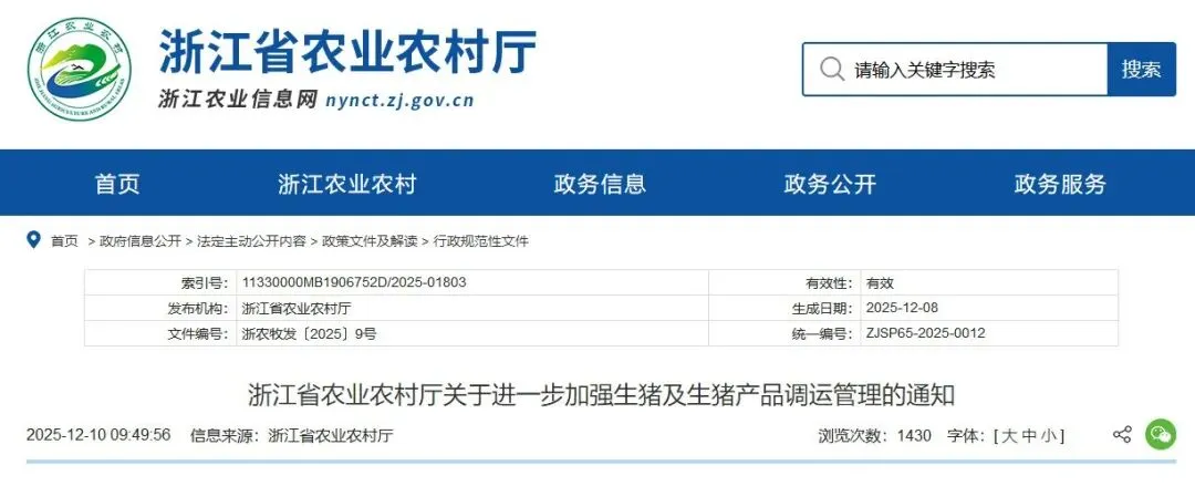 附件下载:浙江省农业农村厅关于进一步加强生猪及生猪产品调运管理的通知