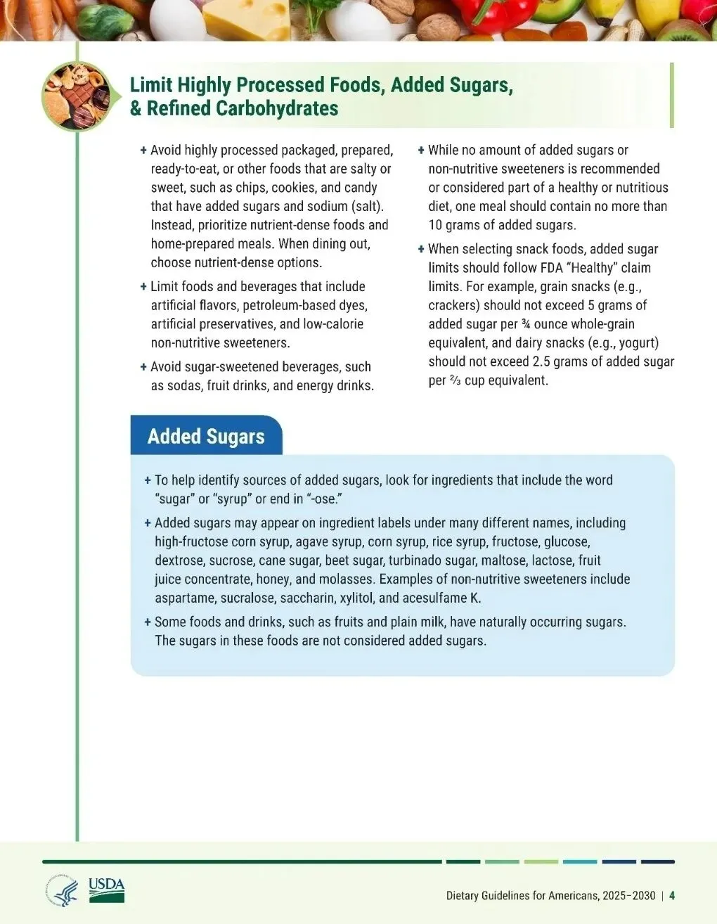 指南指出应避免食用高度加工的包装食品、预制食品、即食食品或其他含糖含盐食品如含糖和钠(盐)薯片、饼干、糖果;应限制摄入合成色素、石油基染料、人工防腐剂及低热量的非营养性甜味剂的食品和饮料。