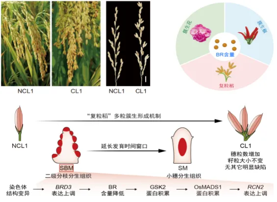 中国农业科学院童红宁/钱前团队联合福建农业科学院赵明富团队,破解了优异水稻种质“复粒稻”多粒簇生的遗传基础,发现精准控制植物激素油菜素甾醇(BR)的空间分布,规避激素副作用,增加穗粒数从而增产。该研究为培育高产水稻新品种提供了重要遗传资源。