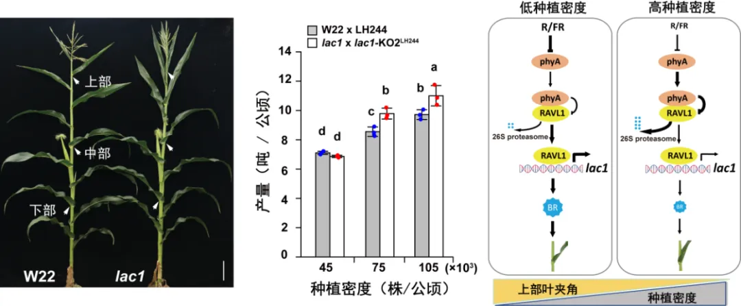 中国农业大学田丰和李继刚团队联合北京市农林科学院等机构,鉴定了控制玉米“上紧下松”的智慧株型基因,揭示了其响应光信号促使玉米适应密植的分子机制,开发了快速编辑靶基因的“一步成系”技术体系。该研究为培育耐密高产新品种提供了重要基因资源与技术支撑。