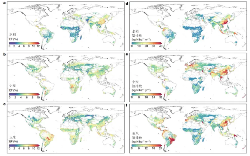 2018年全球5弧分×5弧分格网尺度下水稻、小麦、玉米的农田氨排放因子(a,b,c)和排放强度(d,e,f)