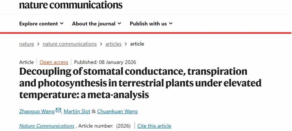 该研究成果以《Decoupling of stomatal conductance, transpiration and photosynthesis in terrestrial plants under elevated temperature: a meta-analysis》为题发表于《Nature Communications》,论文第一作者兼通讯作者为东北林业大学生态学院王兆国教授。