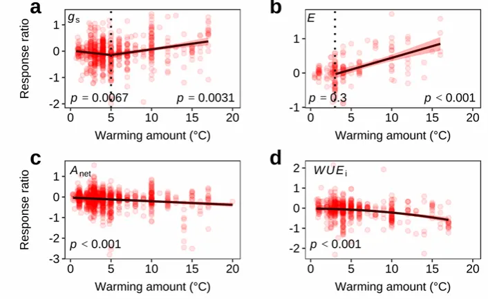 该研究基于对全球207项增温控制实验的整合分析,系统描绘了植物叶片生理功能对温度升高的响应格局,并识别出其中关键的温度阈值与复杂的权衡机制。结果表明,气孔导度和蒸腾作用对升温的响应并非线性,而是呈现出明显的阶段性特征:当增温幅度低于5°C时,气孔导度整体呈下降趋势;而一旦升温超过5°C,气孔导度反而开始上升。蒸腾作用的响应更为敏感,其变化阈值约为3°C——在此温度以下基本保持稳定,超过后则随温度升高显著增强。与之形成鲜明对比的是,叶片光合作用在整个升温过程中持续减弱,未表现出类似的阈值效应。