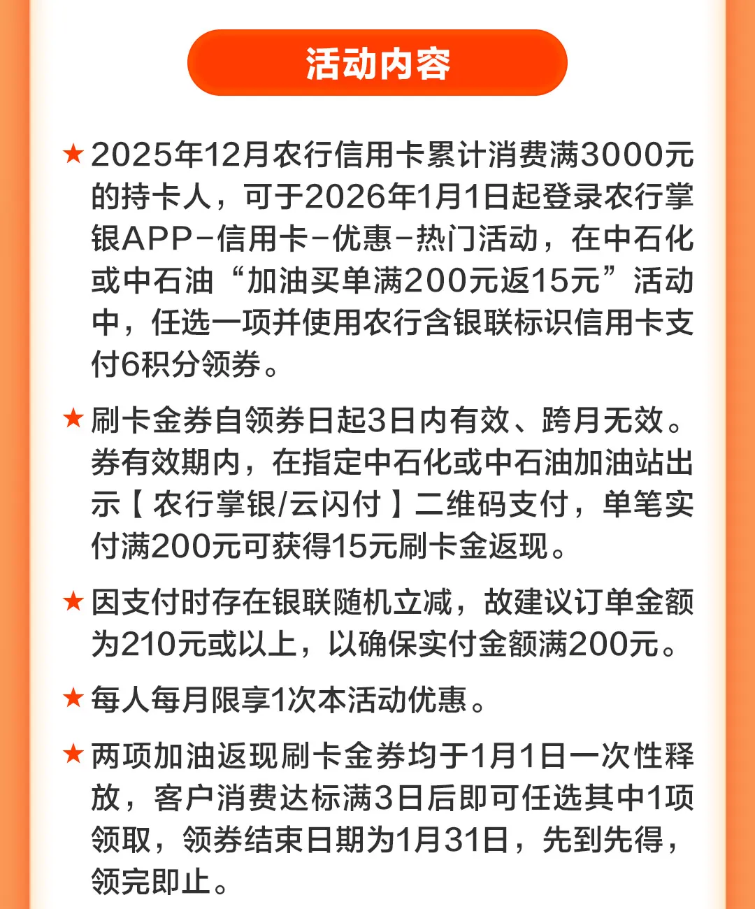 • 如何受:达标后,在2026年1月1日至1月31日期间,登录农行掌银APP,花6积分领取一张返现券。