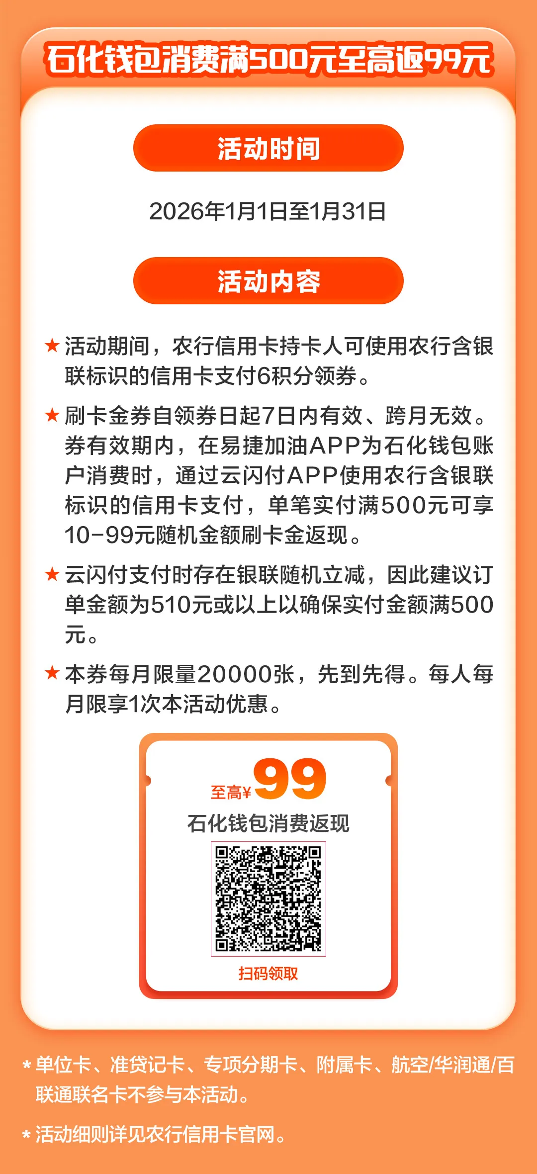 • 使用规则:领券后7天内有效(同样不能跨月)。在易捷加油APP里为你的石化钱包充值时,选择云闪付APP并用农行卡支付,单笔实付满500元,即可获得10元至99元不等的随机返现。