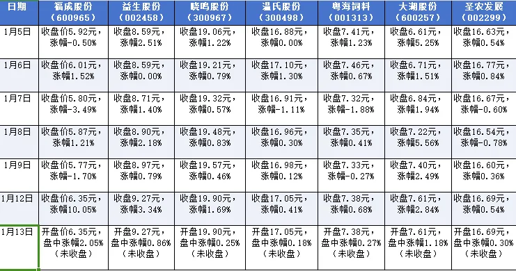 以下为文中提及企业2026年1月5日~13日股市每日股价及涨幅详情表