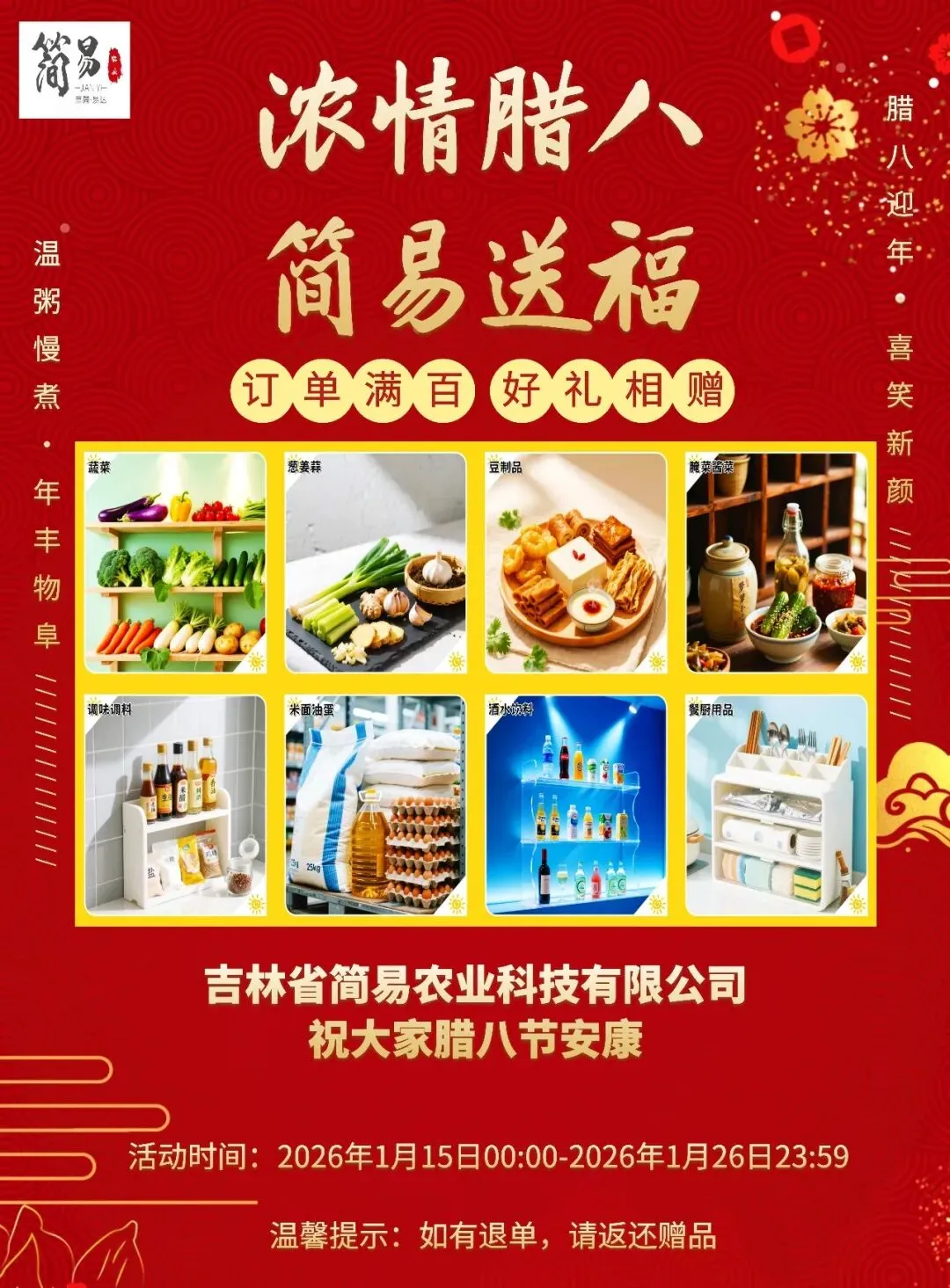 2026年1月15日00:00起,“浓情腊八·简易送福”活动正式开启,只要单笔订单消费满100元,即可获赠新鲜好礼~