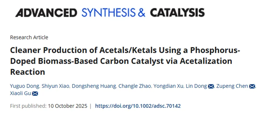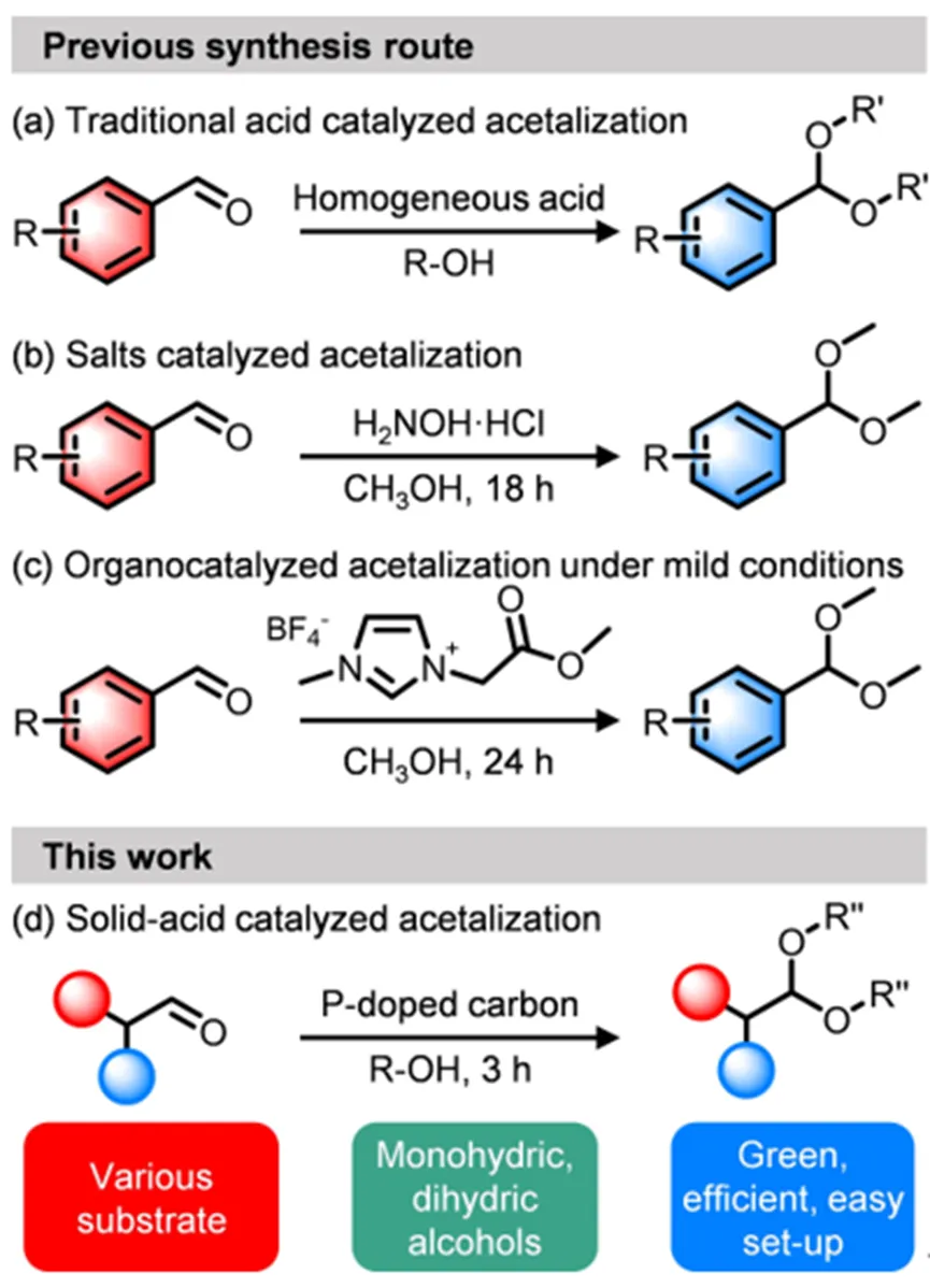 缩醛和缩酮是重要的化工中间体,在香料、聚合物前体及药物合成等领域中应用广泛,此外,还可通过醛/酮与醇的缩合反应实现保护羰基的目标。然而,传统的酸催化工艺存在腐蚀性强、分离困难以及环境不友好等问题。虽已开发出固体酸、离子液体等替代催化体系,但仍面临制备复杂、成本高等限制。近年来,磷掺杂碳材料因其可调的酸性位点、高稳定性及低成本等优势,在催化领域展现出潜力。磷原子的引入可调控碳材料电子结构,产生丰富的Lewis/Brønsted酸位,已在生物质转化等领域表现出优异的催化活性。然而,该类材料在缩醛化反应中的应用尚待深入探索,开发高效、稳定的磷掺杂碳基催化剂对推进羰基保护反应的绿色化与实用化具有重要意义。