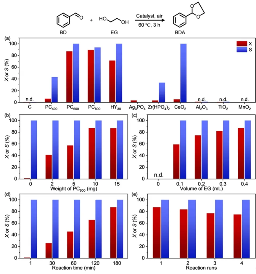 图2 不同a. 催化剂种类,b. PC600用量,c. EG体积,d. 反应时间对BD与EG缩醛化反应生成BDA的影响。e. PC600催化剂的循环反应。反应条件:10mg催化剂,13mgBD,0.4 mL EG,2.6 mL二氧六环,60 ℃, 空气氛围,3 小时。