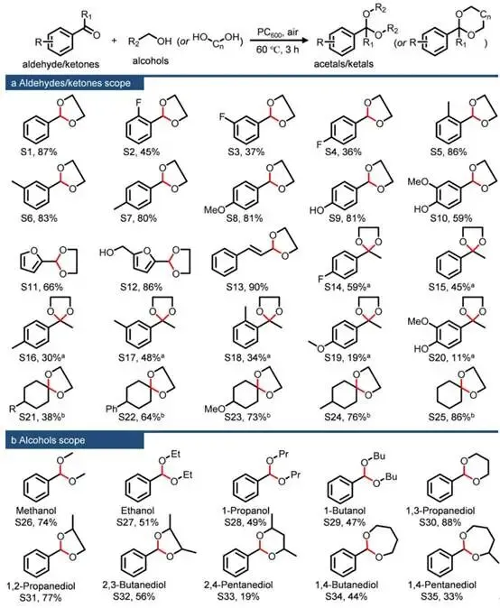 图3 a. 不同醛和酮,b. 不同醇在缩醛化反应生成缩醛和缩酮的产物拓展。反应条件:10 mg PC600催化剂,13 mg底物,0.4 mL醇,2.6 mL二氧六环,60℃, 空气氛围,3 小时。-R=COOC2H5;a80 ℃,24 小时;b80 ℃, 1小时。