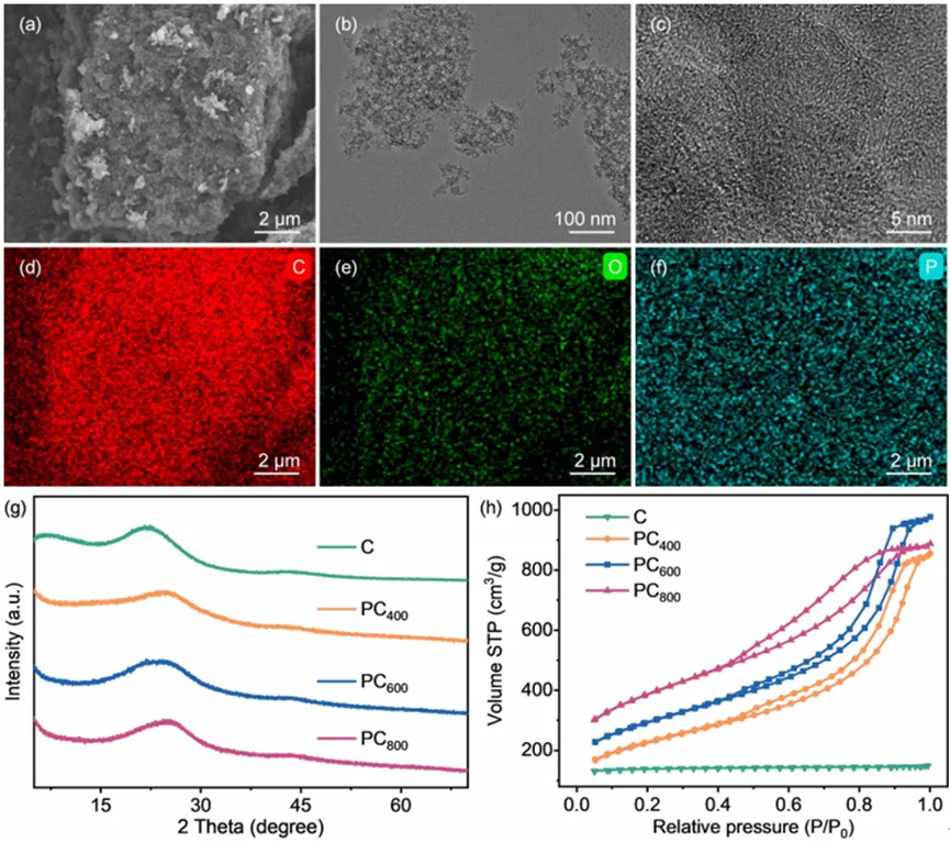 图4 所合成的催化剂的a. SEM图,b. TEM图,c. HRTEM图,d-f. EXD mapping图,h. 氮气吸附曲线图。